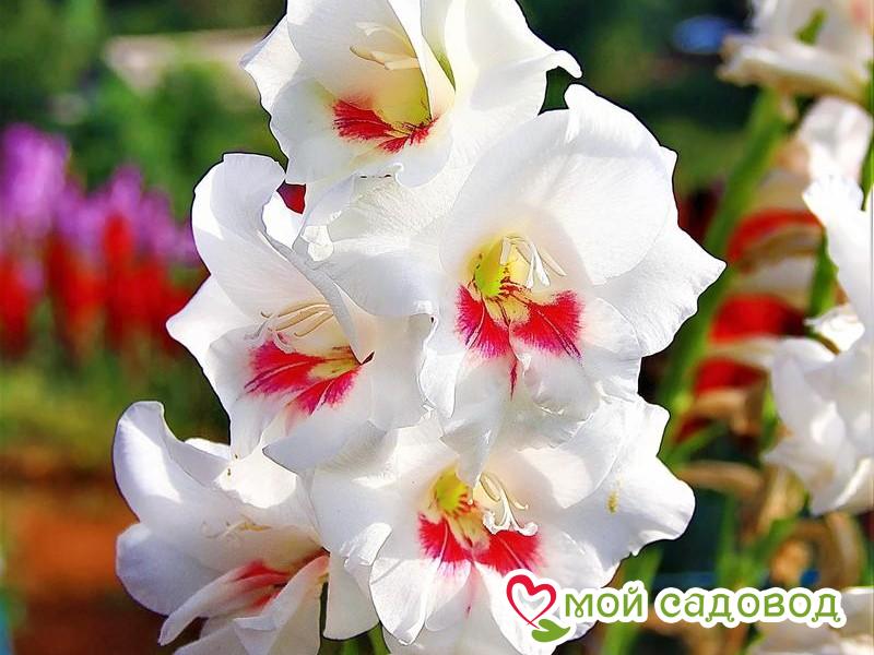 Гладиолус Карин (Carine) Растение с нежными цветами белой окраски и фиолетовой серединой. Высота растения колеблется от 45 до 60 сантиметров. Оптимальная почва: хорошо дренированная, мульчированная. Особенности ухода: хороший полив, но без застоя воды, применение микроудобрений, рыхление почвы, прополка сорняков. Особенности размножения: детками, образующимися вокруг клубнелуковиц. Возможно и семенное размножение для выведения новых сортов. Применение: в ландшафтном дизайне для создания уютных красивых дворов, в садах. Из них собираются невероятно шикарные букеты. Посадка. Из-за погодно-климатических особенностей в разных регионах России сроки посадки отличаются: На Юге (Краснодарский край (Кубань), Северный Кавказ) — сажать можно уже в конце апреля. В Средней полосе (в т. ч. Подмосковье) — оптимальное время приходится на начало или середину мая. В Сибири, на Урале, в Ленинградской области — в середине или конце мая. Места посадки должны быть солнечными, без сквозняков и с качественно дренированной почвой. Затенённые участки плохо сказываются на развитии культуры. Однако в южных районах небольшое затенение допускается. Глубина высадки луковиц обычно составляет 8-10 см (для мелких), 10-15 см (для крупных). Полив. Средняя частота поливов культуры составляет раз в неделю, а летом, в жаркие дни, один раз в 3-4 суток. Поливают утром или вечером, используя около 10-12 л воды на 1 м2. Полив производят в специально подготовленные междурядные борозды, углублённые до 30-50 мм с тем, чтобы капли воды не попадали на листики гладиолусов. Без регулярного полива цветы быстро завянут. По завершении процедуры кусты окучивают. Раз в декаду обязательно производят рыхление почвы.
